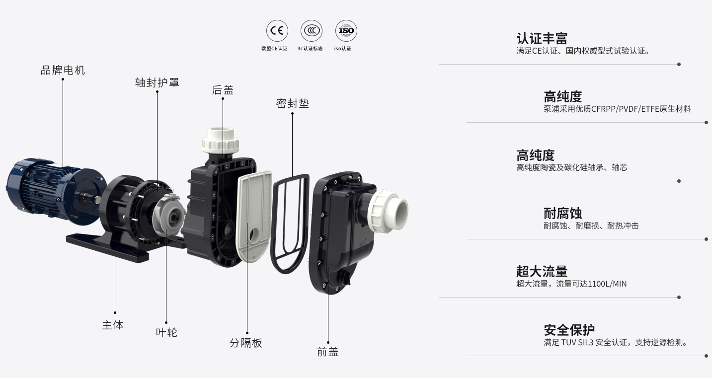 主體與葉輪獨立設計,拆裝(zhuang)便(bian)捷; 泵浦采用(yong)優質原生PP/PVDF, 提升耐腐蝕能(neng)力(li)及結構強(qiang)度(du); 內置(zhi)自(zi)冷(leng)式防空轉系統,
